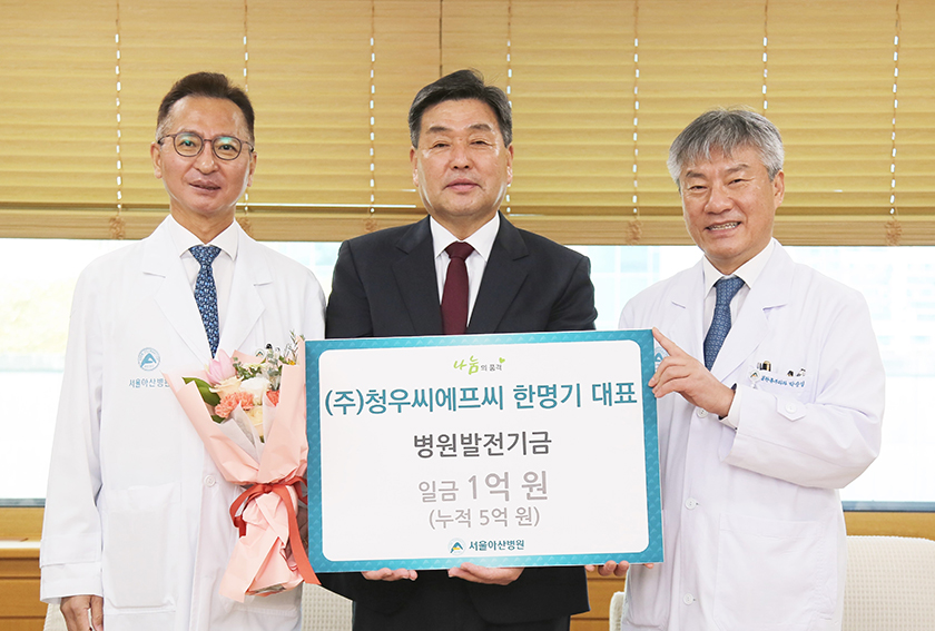 세제 제조업체인 (주)청우씨에프씨의 한명기 대표가 병원발전기금 3억 원을 후원했다. 한 대표는 2021년부터 지속적으로 후원하고 있고 누적 후원금은 총 5억 원이다. 2024년 1월 15일 진행된 감사패 증정식에는 한명기 대표, 박승일 병원장, 최재원 대외협력실장 등이 참석했다.