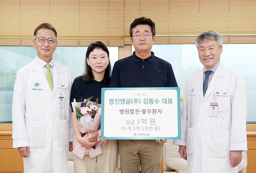 물류 보관 랙 설계·시공 업체인 영진앵글(주)의 김동수 대표가 병원발전과 불우환자를 위해 1억 원을 후원했다. 김 대표는 2018년부터 지속적 으로 후원하고 있고 누적 후원금은 총 5억 5천만 원이다. 2024년 9월 12일 진행된 감사패 증정식에는 김동수 대표, 배우자 김정희 님, 박승일 병원장, 최재원 대외협력실장 등이 참석했다.