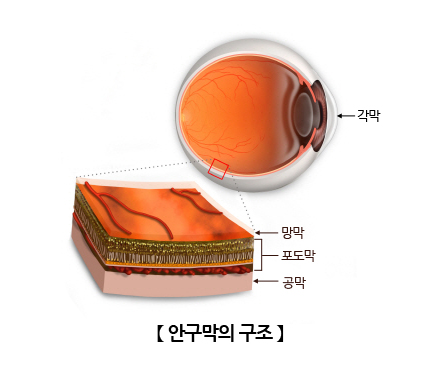눈은 세 종류의 막으로 둘러 싸여 있는데, 가장 바깥쪽을 공막, 가장 안쪽의 신경이 분포하는 막을 망막, 중간막을 포도막이라고 합니다. 중간에 위치한 포도막은 혈관이 많고 부드러운 얇은 막으로, 빛의 양을 조절하는 홍채, 수정체를 받쳐주는 모양체, 그리고 눈 바깥의 광선을 차단하는 맥락막으로 이루어져 있습니다.