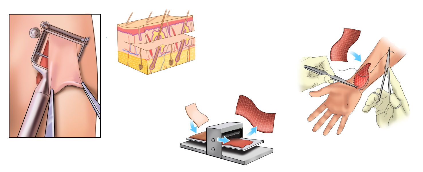 결손 부위의 크기에 맞추어 떼어낼 피부를 주름 방향에 맞추어 타원형으로 디자인합니다. 칼과 가위를 이용하여 디자인한 그림대로 피부 이식편을 표피와 진피 모두를 포함하여 떼어냅니다. 떼어낸 이식편의 바닥에 일부분 붙어 있는 지방을 가위로 제거하여 피부 이식편이 결손 부위 바닥과 잘 접촉하여 살아날 수 있도록 합니다.