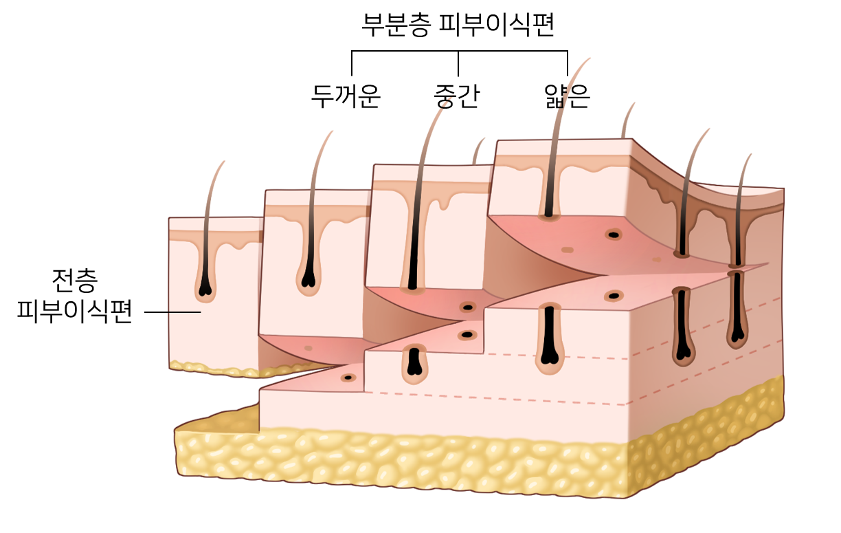 이식하는 피부를 어느정도의 두께로 삼느냐에 따라 부분층 피부 이식과 전층 피부 이식으로 나뉘게 되는데 각각의 방법은 다음과 같습니다.