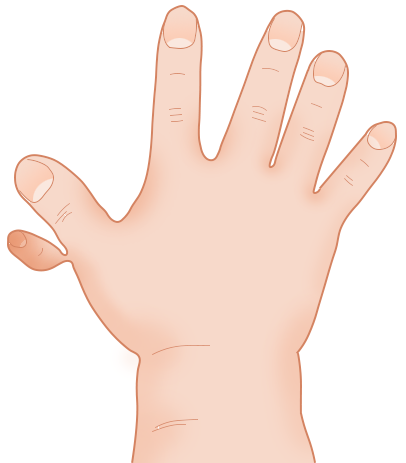 한쪽 손에 손가락이 여섯 개 이상일 때 다지증이라고 합니다. 손에 가장 많이 나타나는 선천성 기형입니다. 백인과 흑인에서는 대략 생존 출생 10,000명당 1명 정도가 다지증인 것으로 보고되지만, 아메리카 인디언이나 우리와 같은 몽골족에서는 이보다 흔하게 4,000~5,000명 중 1명 정도로 나타난다고 합니다. 다지증의 85%는 엄지손가락에 발생하지만 새끼손가락에 발생하기도 합니다.