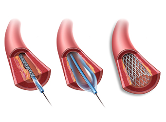 경피적 혈관 성형술은 국소마취를 하고 혈관을 천자하여 풍선이 달린 도관을 동맥의 협착 부위에 삽입한 뒤, 풍선을 팽창시켜 혈관을 넓혀 폐색을 제거하는 치료법입니다. 풍선 확장술만으로 효과가 제한적이라면 스텐트를 삽입하게 됩니다.