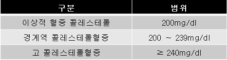 경계성의 콜레스테롤인 경우 고단백 또는 저단백 콜레스테롤 중 어떤 지단백의 비율이 큰지 추가적인 검사가 필요할 수 있습니다. 고 콜레스테롤혈증의 경우 원인을 추적하기 위한 기타검사를 추가적으로 시행할 수 있습니다.